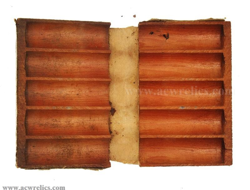 Description: Very rare empty box for the .60 or 20 gauge Colt Revolving Shotgun. This style of box uses a split wooden block which was used 1860+. These boxes are relatively scarce when you think about how many revolving shotguns were manufactured. This example has No. 8 shot as stated on the label. There are other examples out there marked for buckshot in a few sizes. The paper label is intact on the front, top, and back, with some remaining on the other sides. You can open the packet up to see the drilled wooden block on the inside. A very rare and scarce Civil War era packet. The label reads as follows: