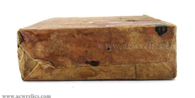 Description: Very nice complete rewrapped packet containing five paper time fuses manufactured at the Frankford Arsenal. In late 1862, all paper time fuse production shifted to the Frankford Arsenal for standardization. Jones added a shortened quote in his book stating, "To secure uniformity in size and rate of burning, …all paper time fuses will be made at…Frankford Arsenal.” From 1863-1865 paper time fuses were manufactured at the Frankford Arsenal in a variety of colorful packets with various burn times.