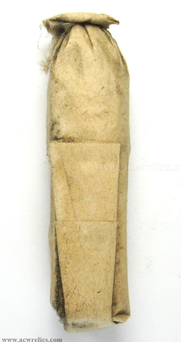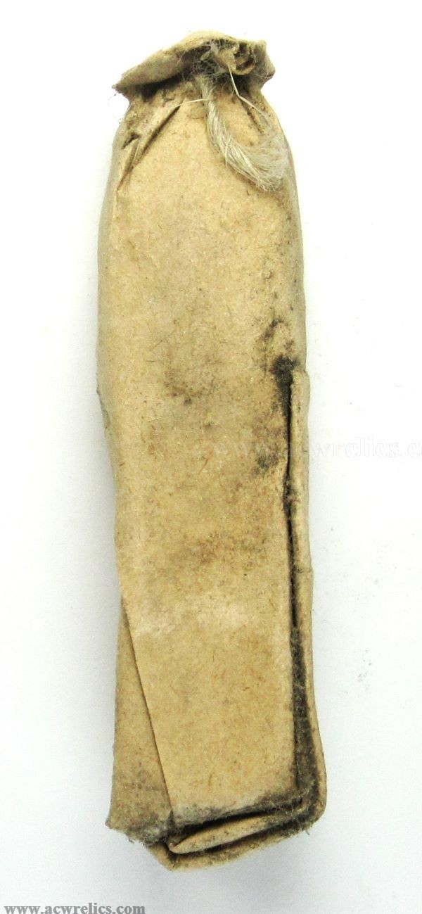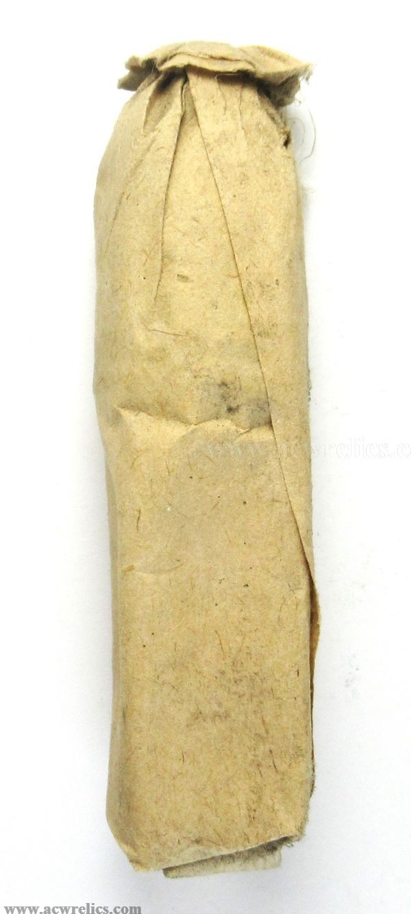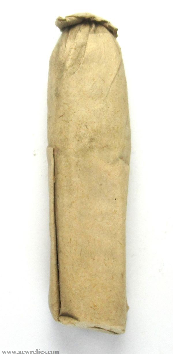 Description: Very nice example of the .58 paper cartridge used during the American Civil War. This example is straight out of an original packet of St. Louis Arsenal cartridges dated 1864. There is still dust in the creases that can be brushed off. The .58 paper cartridge was used in the M1855, M1861, and M1863 rifled muskets and was the most widely used cartridge type during the war. I have included a photo of the original packet and contents which are not included. Unfortunately, the packet was damaged too badly to save. This would make a great addition to any Civil War cartridge collection!