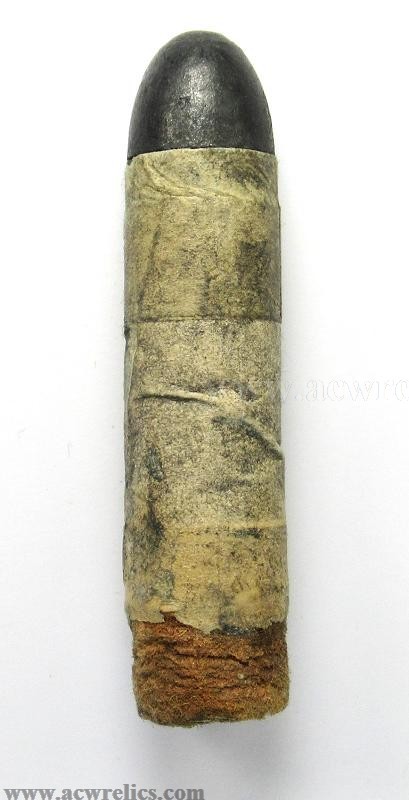 Description: Very nice Calisher & Terry Carbine cartridge missing the outer paper wrapper. This is the 30-Bore or .537” paper cartridge used in the Terry’s Patent Type II Carbine. These carbines were predominately used by British Cavalry forces, but some were imported and used in the American Civil War. Both Jefferson Davis and J.E.B. Stuart had one during the war. Interestingly, this cartridge is manufactured and wrapped just like the British "Monkey Tail” cartridges. This paper wrapped cartridge has a powder charge between the bullet and the felt wad on the base. The paper and felt wad are in good shape with soiling on the paper. A hard-to-find cartridge!