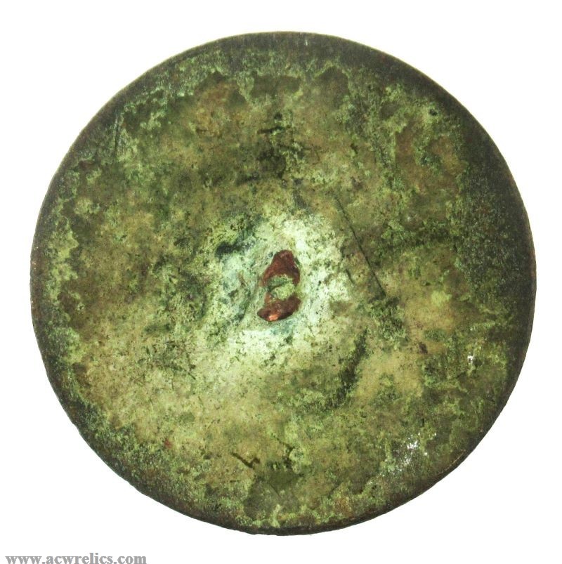 Description: Decent excavated one-piece "Dandy” button. This example has rings on the face with plenty of gilt left. The shank is missing.