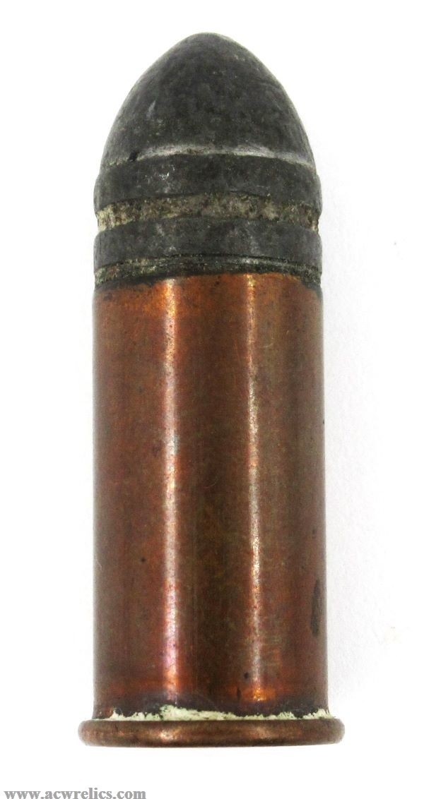 Description: Very nice .44 Henry rimfire cartridge with a pointed bullet and short case. This example is attributed to Ethan Allen & Co. It has a pointed projectile with two raised bands. This cartridge could be used in the .44 Henry, M1866 Winchester, and a few different revolvers.