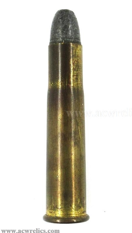 Description: Nice example of the .32-30 board dummy cartridge. These were used in the Remington-Hepburn No. 3 single-shot rifles. These first appeared in the 1880’s and were gone by the early 1900’s. This example has a flat nose, belted bullet. The necked case is brass with a brass primer. There are two holes on the board side along with a single stab crimp holding the bullet in place. The bullet has a small flat spot on the edge of the nose and the case is lightly spotted.