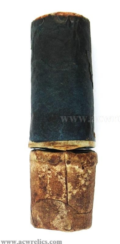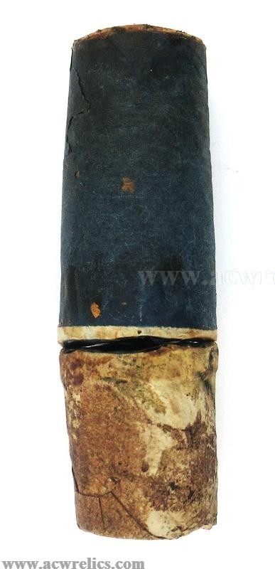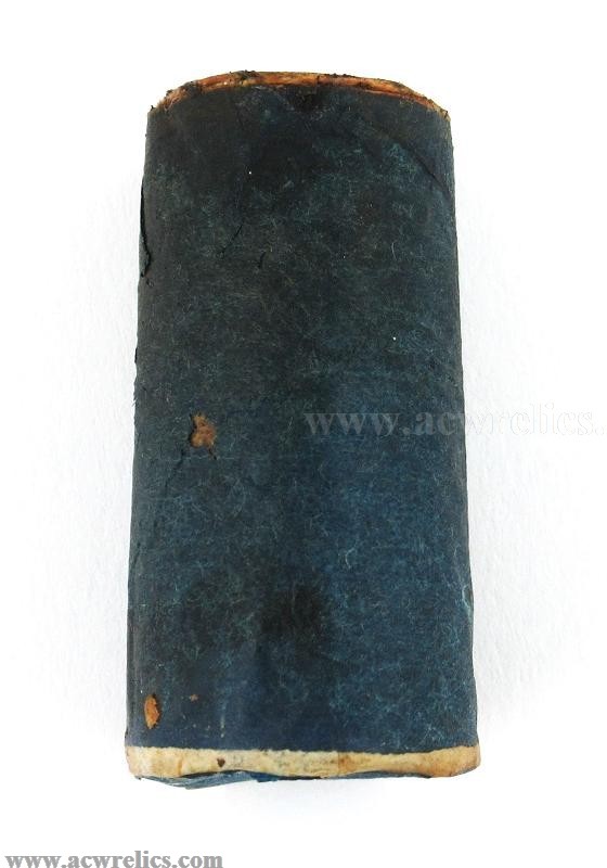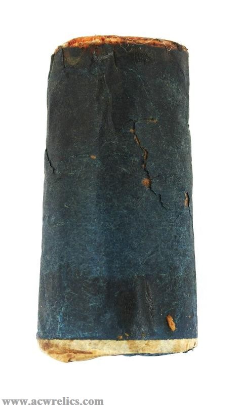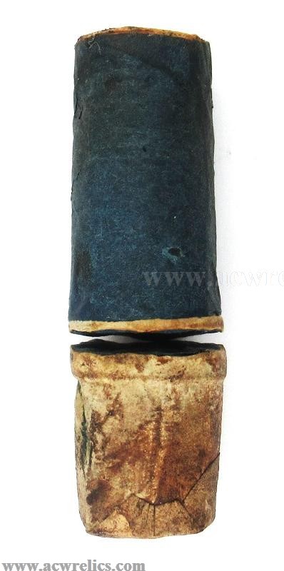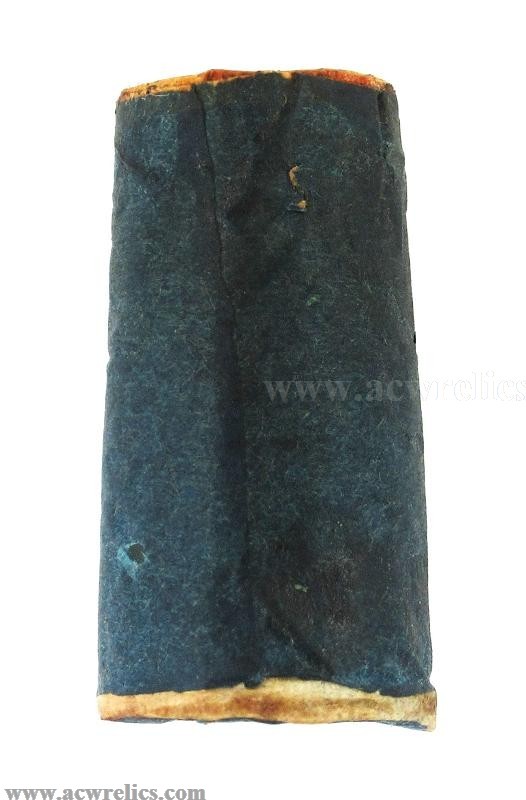 Description: Very rare two-piece cartridge for the 20Ga. or .60 Colt Revolving Shotgun. The top portion contains the shot wrapped in dark blue paper. The bottom portion containing the powder is wrapped in treated buff white paper. This example is right out of a packet and was manufactured by Colt’s Cartridge Works of Hartford, Connecticut. This is about as minty as they come! I’ve included photos of the top and bottom of each section as well. An excellent Civil War Era cartridge for the rare Colt Revolving Shotgun!