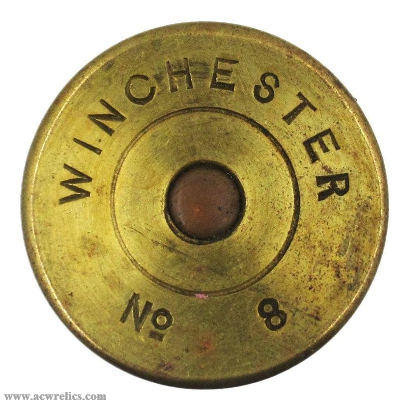 Description: Nice example of a No. 8 Winchester "board dummy” shotshell. These were used on the Winchester cartridge boards in the late 1890’s up through the beginning of the 20th century. This example has a grayish/black color with light soiling that has faded with time. The head is in nice shape with some spotting/oxidation on the sides of the brass cup. This paper shotshell has a copper primer and two holes on the board side. A nice example of a Winchester No. 8 "board” shotshell!