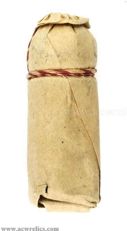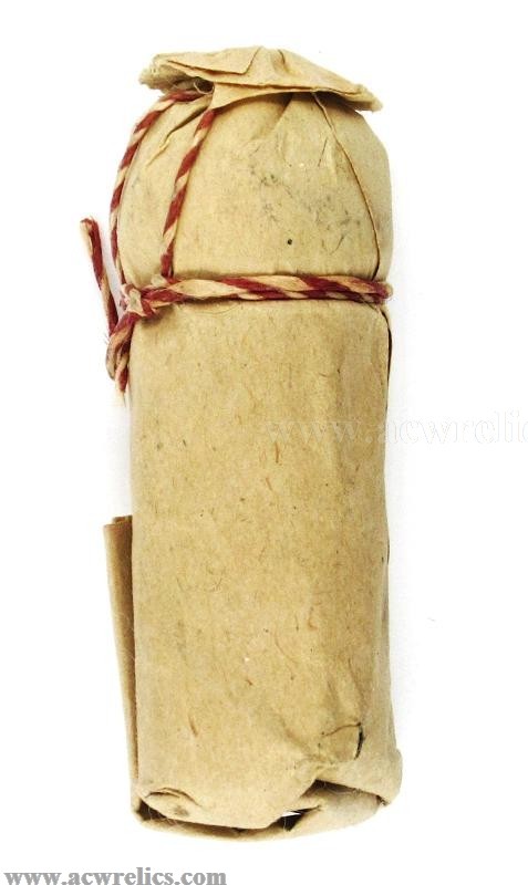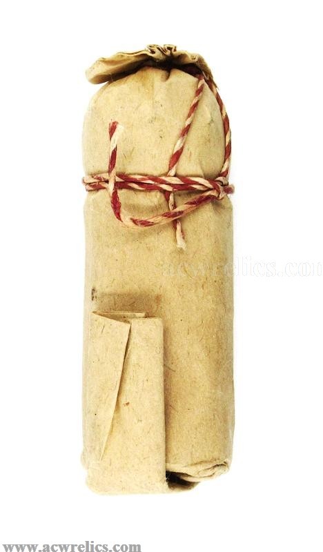 Description: Decent .69 round ball cartridge tied with a red and white twisted string. These are pre-Civil War cartridges and are thought to be used in the .69 pistols or the Hall carbine. This example appears to be right out of a packet with very little soiling. There is one very small pinhole near the bottom of one side. A very nice example for the price!