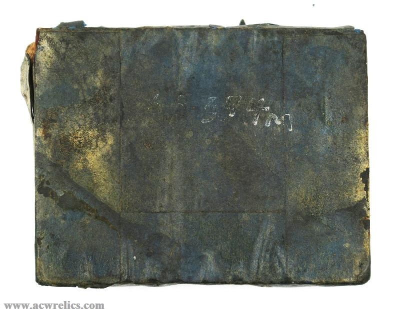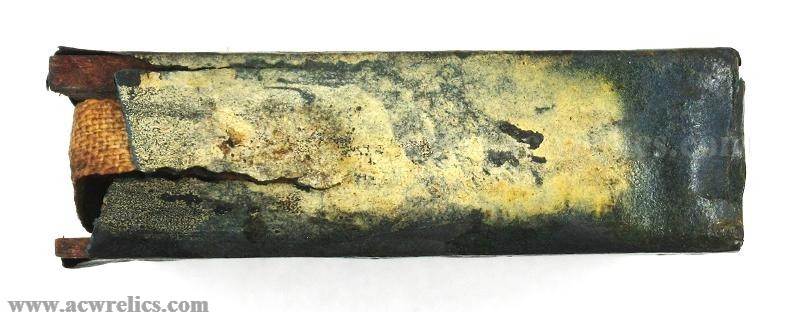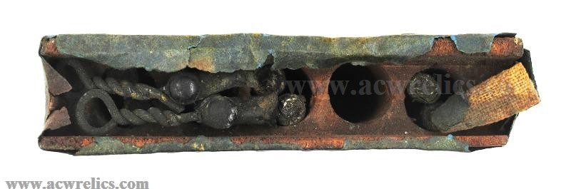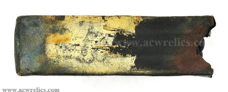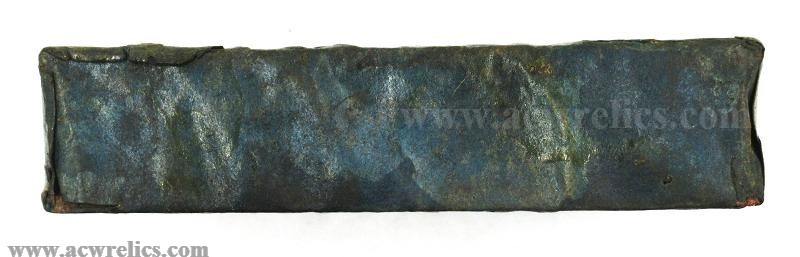 Description: Scarcer, large size packet that originally contained 10 Civil War friction primers manufactured at the Frankford Arsenal. The majority of the packets encountered are the five packs. This is the larger size ten pack. The label reads, "10 / Friction Primers / For / Cannon / Frankford Arsenal / 1863.” The front label shows a friction primer on each side of the face. This example has been opened across the top revealing eight original remaining primers. The bottom portion remains unopened. The outer dark blue wrapper remains mostly intact with a few light spots. The waterproof coating still partially covers the surface and shines on the top of the paper. There is a faded collection number on the back in white. A scarce variant that isn’t often encountered!