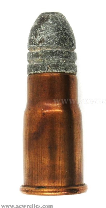 Description: Nice .56-46 Spencer rimfire cartridge used in the Spencer Sporting Rifle. This example has a flat nose bullet with two deep cannelures and a necked down copper case. It was probably manufactured by the Union Metallic Cartridge. A very nice example without a headstamp!