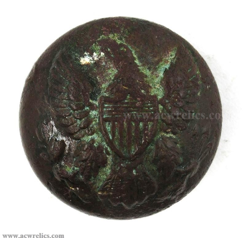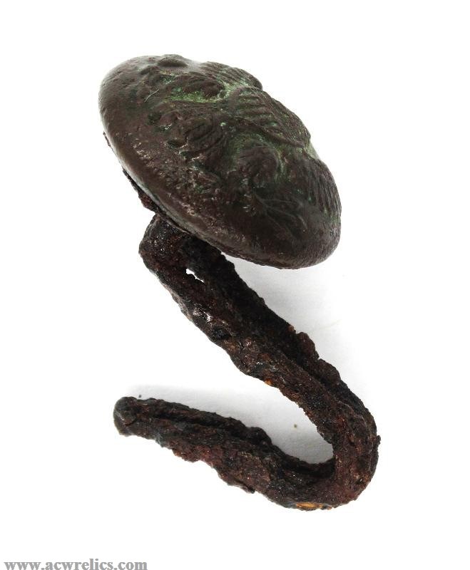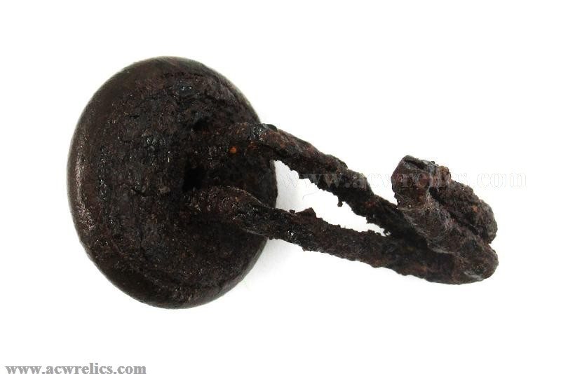 This is an excavated example. The iron spring-hook on the back is present with pitting. The face of the button portion is very nice without any pushes or cracks. These are becoming increasingly hard to find in complete, dug condition!