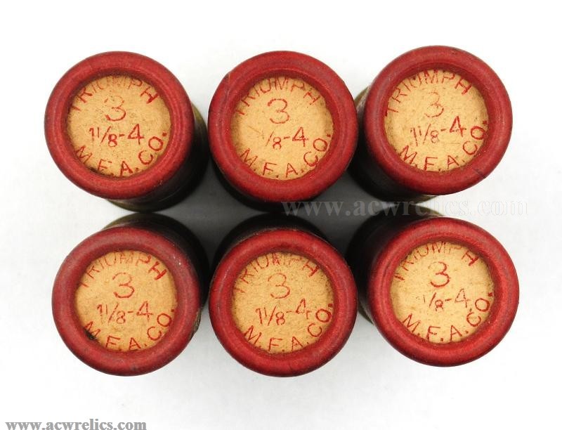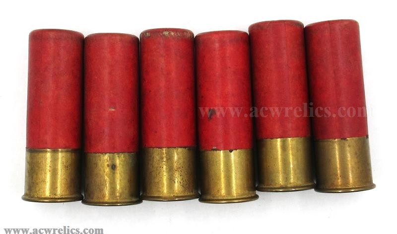 Description: Lot of six 12 Ga. "POINTER” shotshells manufactured by the Meriden Fire Arms Company of Meriden, Connecticut. All six shotshells have the same factory load. They have 3 drams of smokeless powder, 1 1/8 Oz. of shot, and No. 6 pellets. All six shotshells have a uniform red color. This group would be perfect if you are trying to fill a box up with original loads. I have added a photo of a similar box that is not for sale. It’s just used for comparison. These shotshells are loaded with British Triumph powder which would date them from 1906-1909.