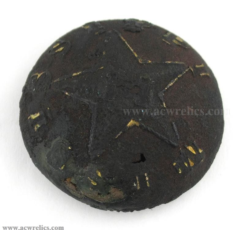 Description: Decent example of a Confederate Mississippi Infantry coat button. This example has a five-pointed star with an "Iā€ in the middle surrounded by "MISSISSIPPI.ā€ These were manufactured by Scovill for Hyde & Goodrich. This example has wear to the face but is legible. There are a few small pinholes on one side of the button near the edge. The shank is slightly bent. A decent example for the price!