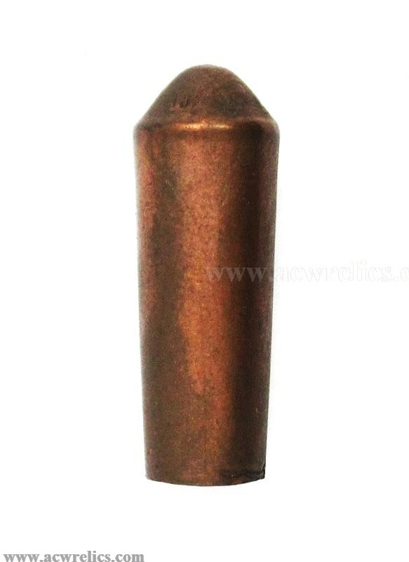 Description: Scarce example of the Jacob’s Percussion Tube. These examples are empty, and it appears the compound has been removed. The copper tubes have a sharp pointed nose with a tapered rear that is opened on the end. These tubes were inserted into the nose cavity of Jacob’s bullets creating an explosive tipped projectile that would explode upon impact. These come in a variety of sizes. These examples are lightly embossed "ELEY” around the edge of the nose.