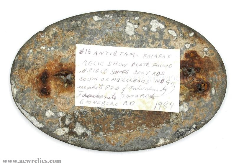 Description: Nice example of a US cartridge box plate recovered in the fields approximately 300 yards South of Philip Pry’s house (McClellan’s Headquarters). This example is flat, and the right side is slightly pushed forward. The face has a pleasing chocolate patina. The reverse retains most of the lead solder and the iron attachment loops are missing. The tag on the back reads as follows: