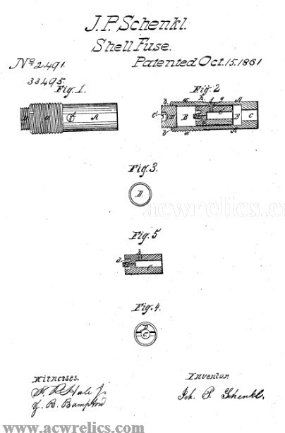 Description: Very nice excavated Schenkl artillery percussion fuse. On October 15, 1861, John P. Schenkl was awarded US Patent No. 33495 for an improvement in the safety concussion-fuse for explosive projectiles to be discharged from Ordnance.