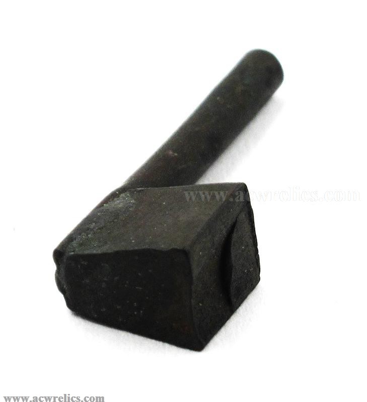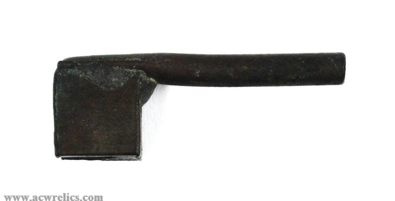 Description: Early English percussion primer. Gooding states that this may be a side-primer tube. This example has a small copper tube soldered onto a wedge-shaped piece of copper. Not much is known about this type, but I would assume the wedge would slide into a rest on the side of the lock holding the primer in place. A scarce variant that isn’t often seen.