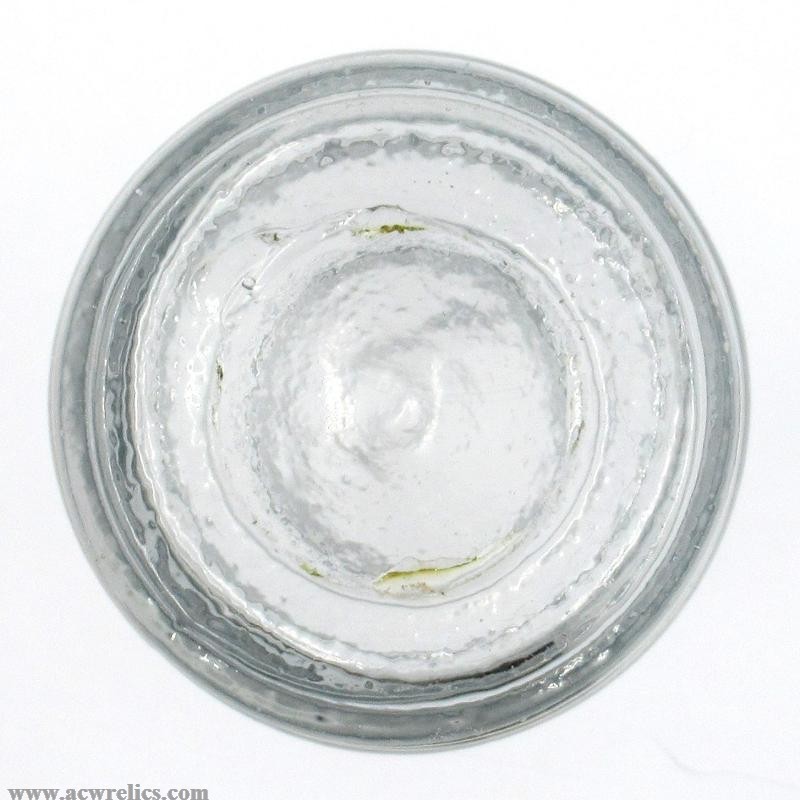 Description: Nice early Civil War era "Barrel Mustard” jar with an open pontil. This example is clean and has been tumbled. You can see a mold seam on two sides of the clear glass bottle. A nice example with air bubbles that would look great in any camp life display.