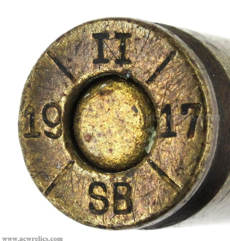 This example features a full metal jacket (FMJ) bullet with a magnetic steel core, often classified as armor-piercing. It is loaded in a brass case with a flat brass primer. The headstamp is marked "II / 1917 / SB", indicating production by Sellier & Bellot in February 1917.