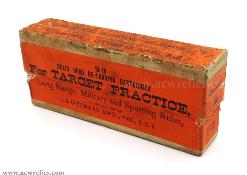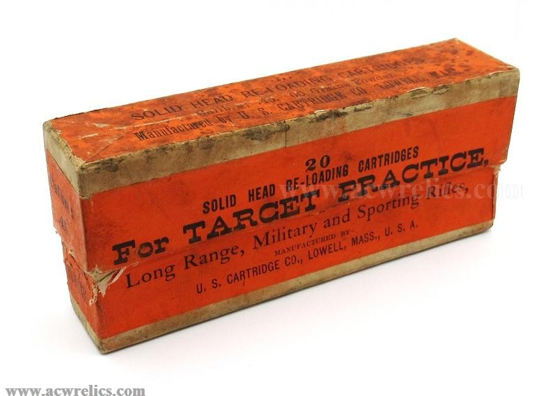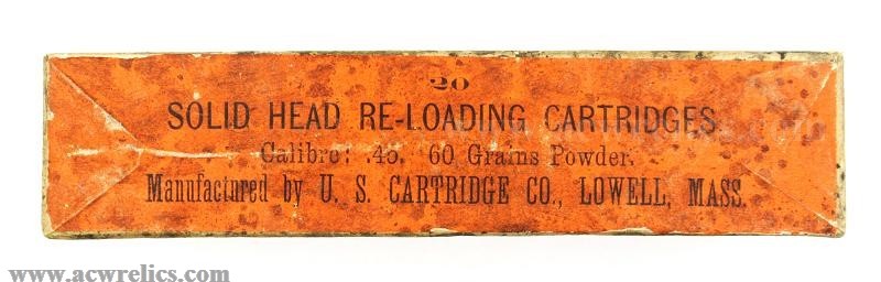 "20 / SOLID HEAD RE-LOADING CARTRIDGES / For Target Practice, / Long Range, Military and Sporting Rifles, / MANUFACTURED BY / U.S. CARTRIDGE CO., LOWELL, MASS., U.S.A.”