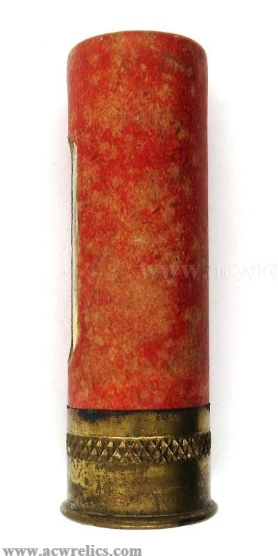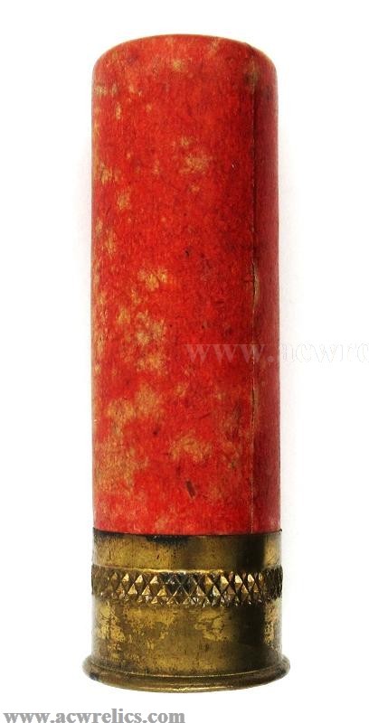 The brass head has a crosshatched corrugation pattern, and the primer has been punched. The load consists of 3 drams of Dupont powder with 1 ¼ oz. of #7 ½ chilled lead shot.