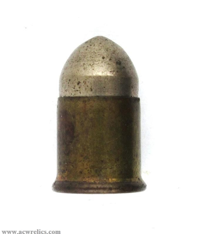 This cartridge features a full metal jacket bullet seated in a brass case with a small copper primer. Well-preserved and clean, it is very similar to the 8mm round used in the American "Protector” palm pistols, though not interchangeable. With their distinctive design and connection to one of the more unusual pocket pistols of the era, these cartridges have become highly sought after by collectors of both ammunition and early concealed-carry handguns. A great example with a few spots on the case.