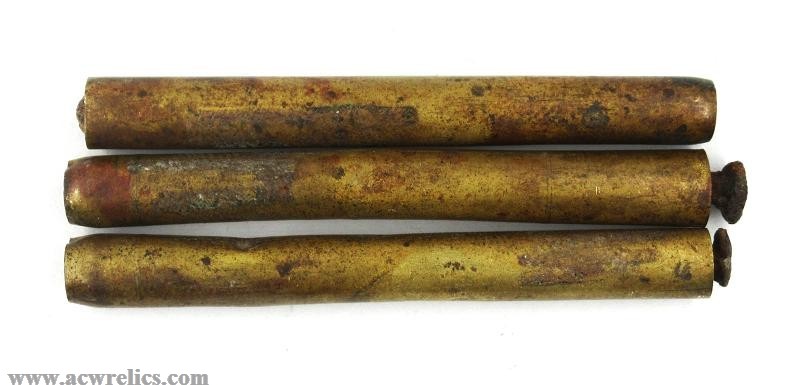 Description: Nice lot of three Lawrence primer tubes for Sharps rifles and carbines. Two tubes are full of primers; one is empty and contains only the original wooden dowel. Two of the full tubes appear to be overfilled and have a small square-headed nail driven into the wooden dowel to retain the primers. I’ve seen this style of tube housed in both the early black-label rectangular tin and the round tin.