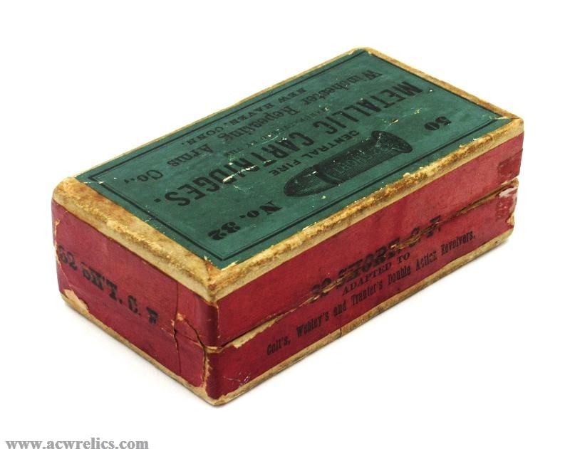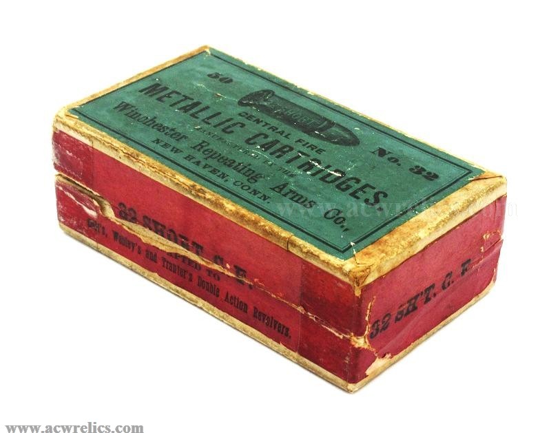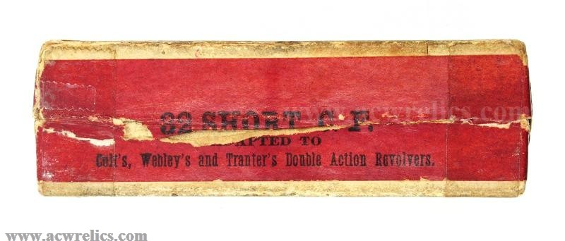 Description: Decent example of one of the earliest .32 Short Centerfire black powder cartridge boxes manufactured by the Winchester Repeating Arms Company. The .32 C.F. was a popular cartridge and was also adapted for Colt, Whitney, and Tranter double-action revolvers. According to Giles & Shuey, this box dates to around the mid-1880s.