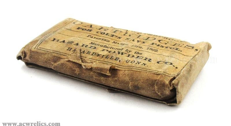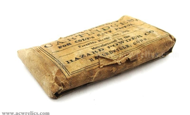 Description: Nice example of an original Civil War–era ammunition packet. This packet contains six .36 caliber "Pressed Waterproof” cartridges for the Model 1851 and Model 1861 Colt "Navy” Revolvers. These cartridges were manufactured by the Hazard Powder Company of Hazardville, Connecticut, and would be correct to display alongside any percussion Colt "Navy” revolver.