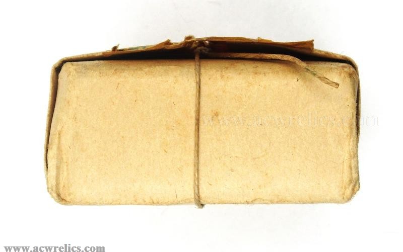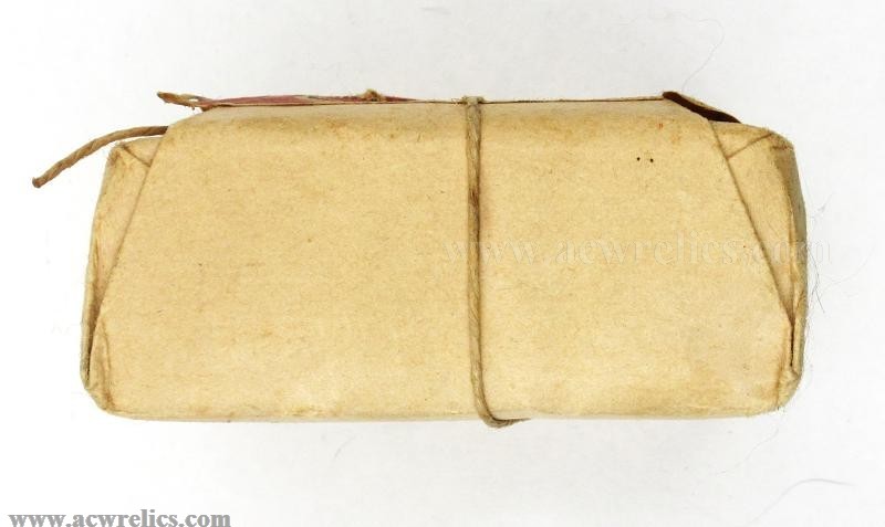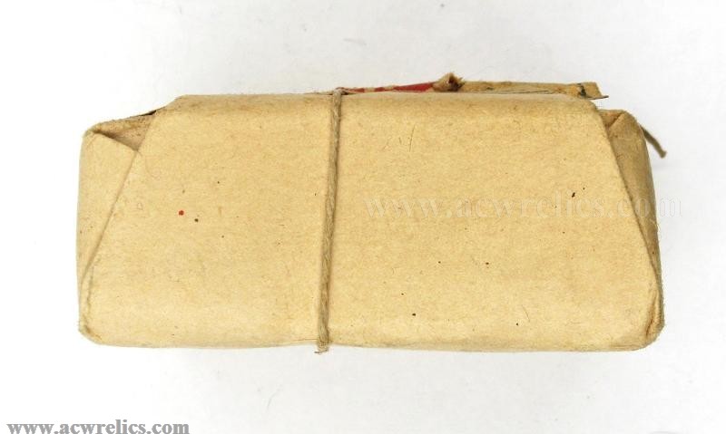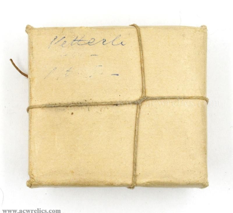 Description: Complete and well-preserved packet of 10.4×38R (.41 Swiss) rimfire ammunition — the cartridge used in Swiss Vetterli rifles. This tightly wrapped bundle contains ten 10.4×38R rimfire cartridges. The cartridges are wrapped in a waxed (or coated) paper sheet and tied off at the front, with the original label applied over the top.