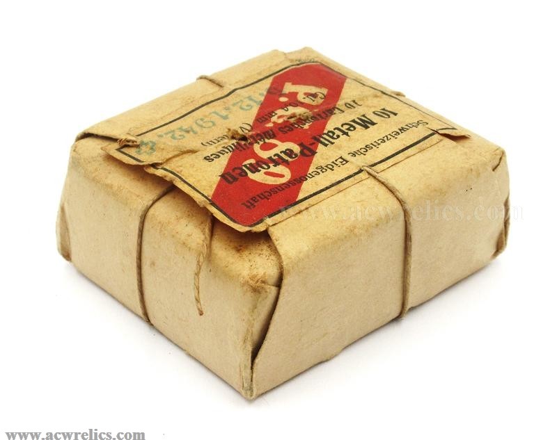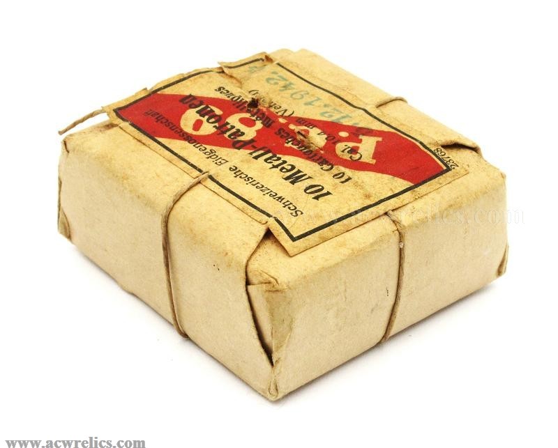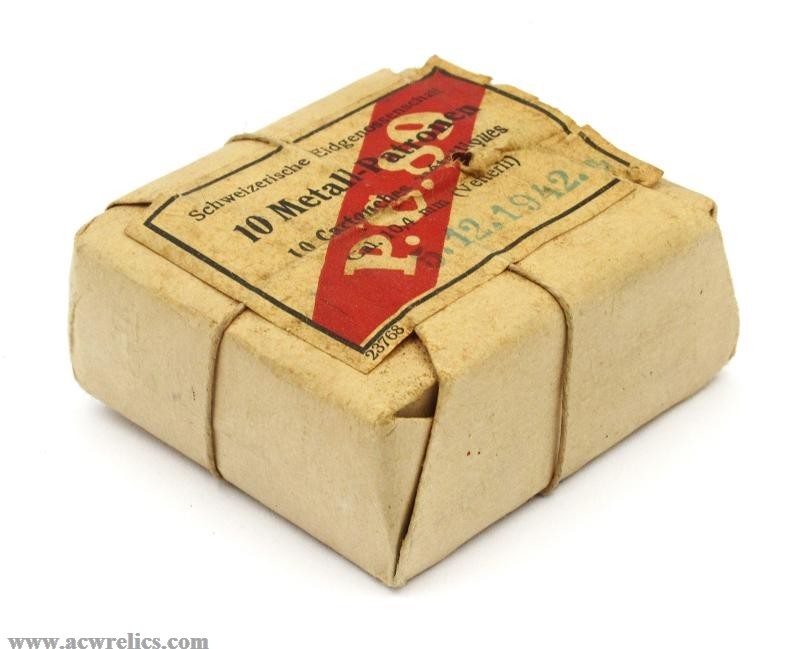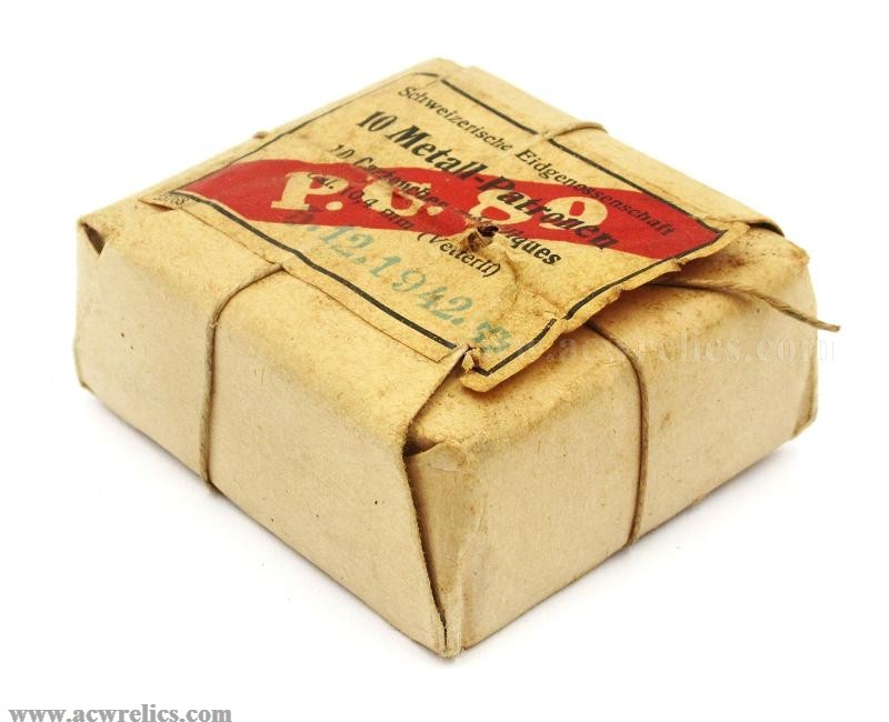 Overall, the packet is in very nice condition and is a desirable example of a late-date (WWII-era) production packet of 10.4×38R (.41 Swiss) rimfire ammunition, suitable for display with Vetterli rifles or as a documented collectors’ piece.