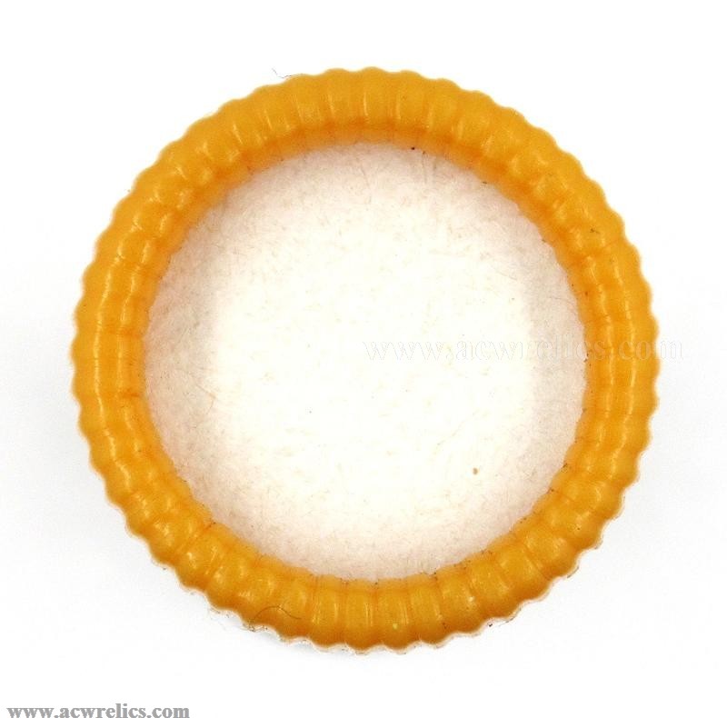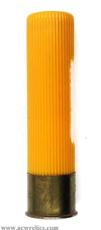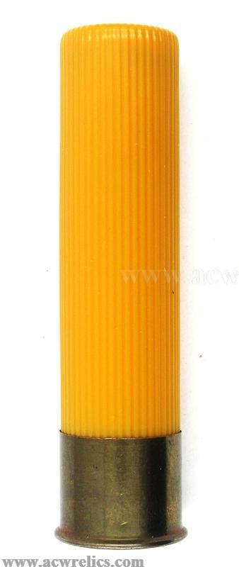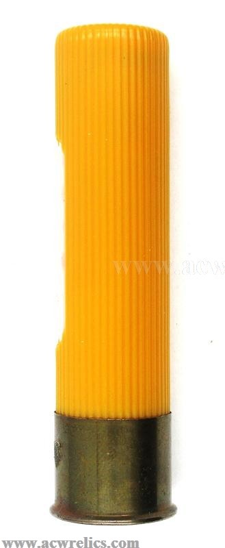 Description: Nice example of a Federal 20 Gauge salesman sample "window” shotshell. This example features a yellow plastic hull with a white top wad. The clear side panel reveals copper-plated shot resting atop a plastic wad. A clean and well-preserved example, representative of the more recent era of these display shells.