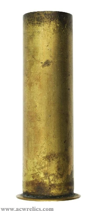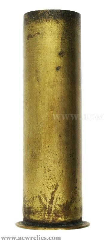 Description: Nice example of a .64 Maynard shot cartridge. This specimen is in decent condition and represents the earlier variant without the brass or copper rivet in the base. This reloadable cartridge has been fired at least once but still retains its overall shape and form.