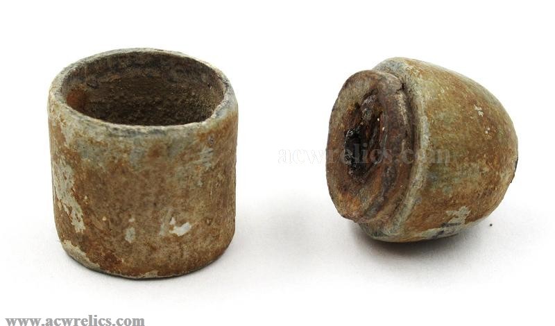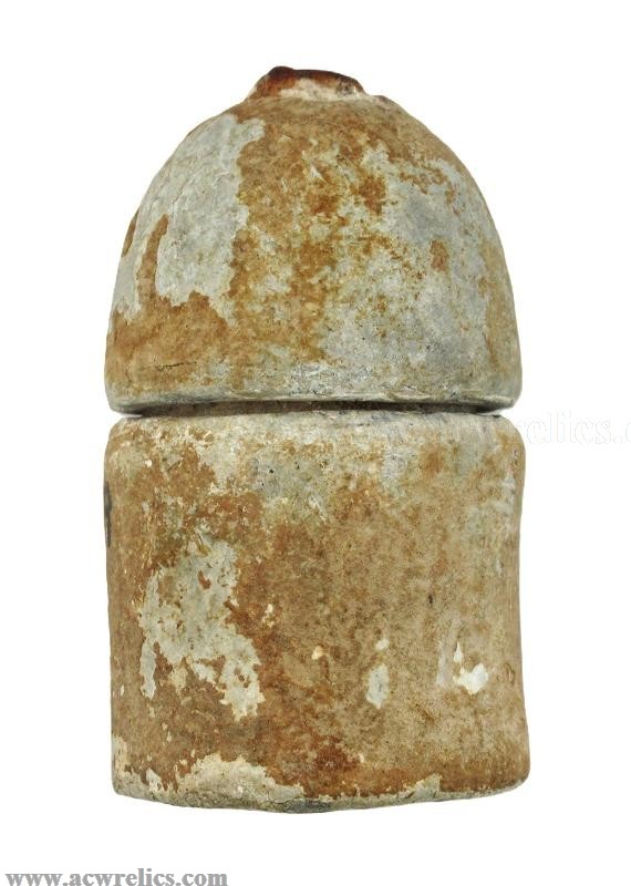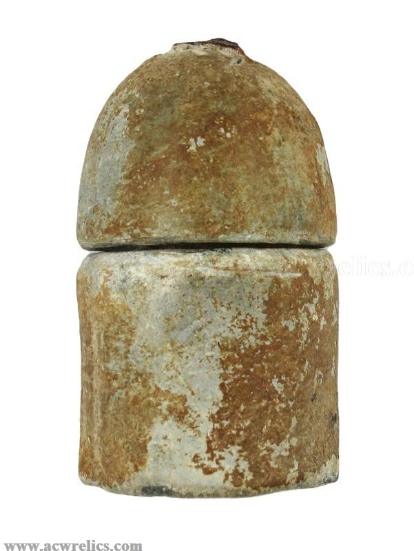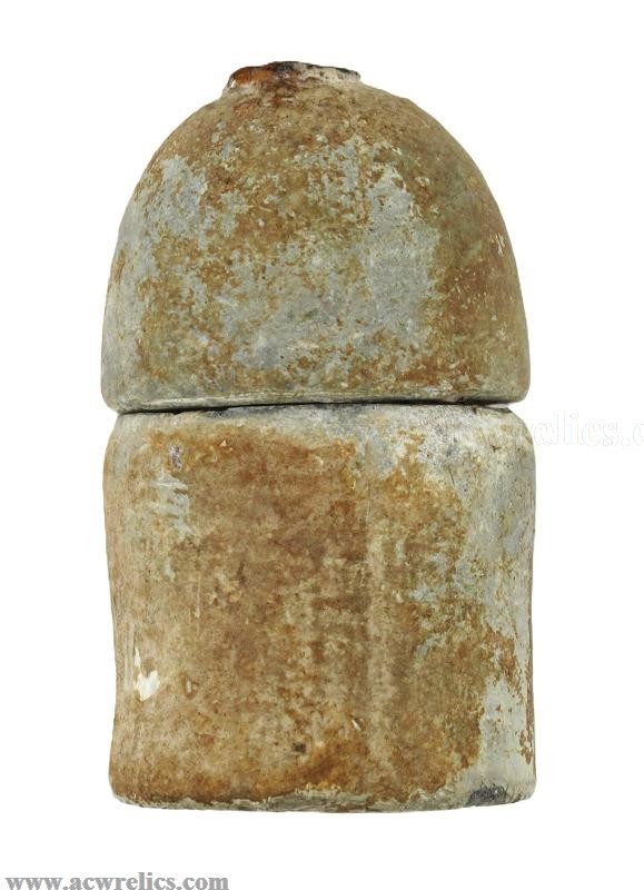 Description: Outstanding, published example of the very rare Confederate two-piece explosive bullet, formerly part of the renowned collection of Dean Thomas. This is the exact specimen illustrated in his Round Ball to Rimfire series.