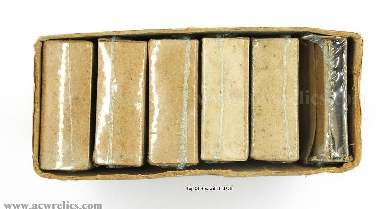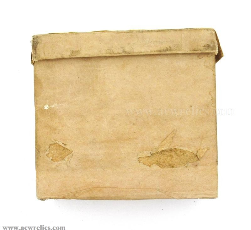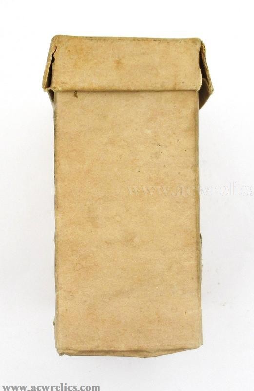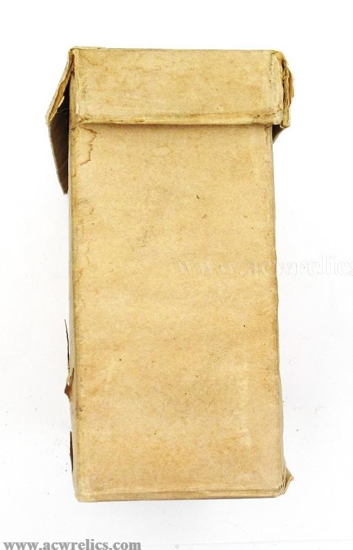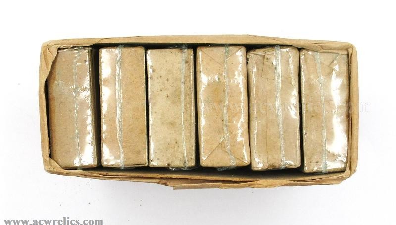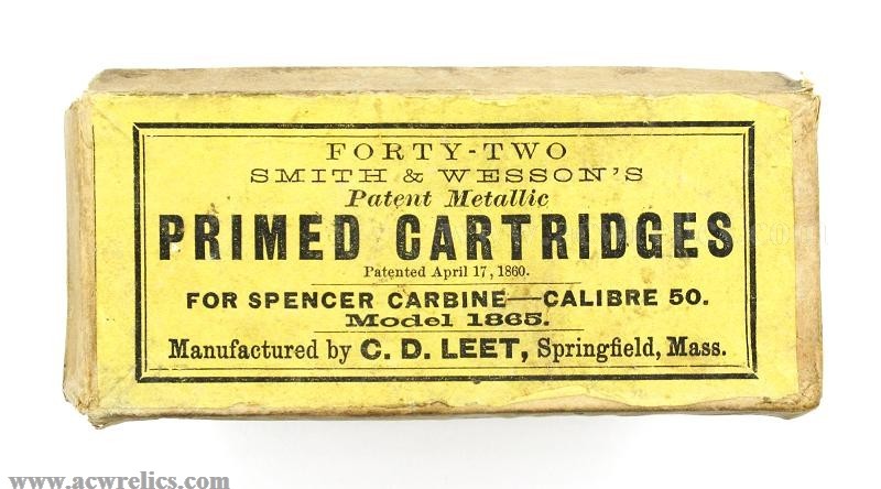 Description: Decent example of a .56-50 Spencer rimfire cartridge box, containing a total of 41 cartridges housed in six original sleeves. These cartridges were widely used during the Indian War period of the 1860s–1870s, particularly in the Model 1865 Spencer carbine, which remained in active service with the U.S. military and settlers in the American West well after the Civil War.