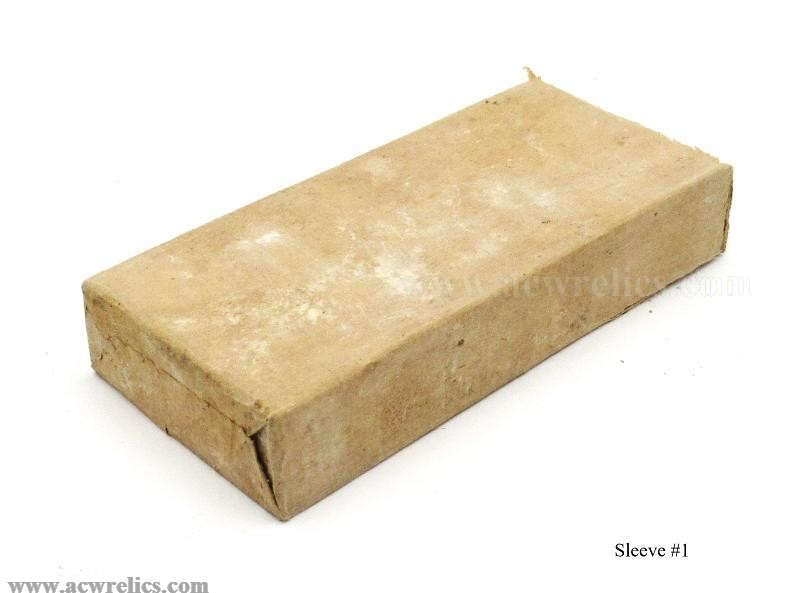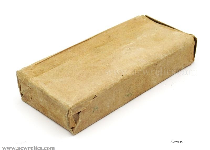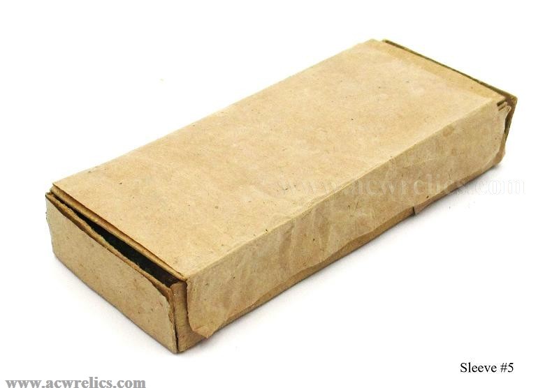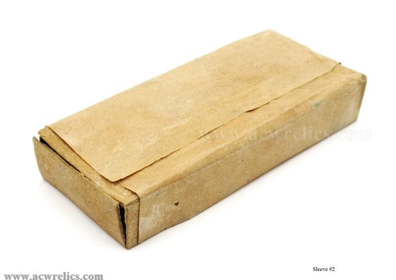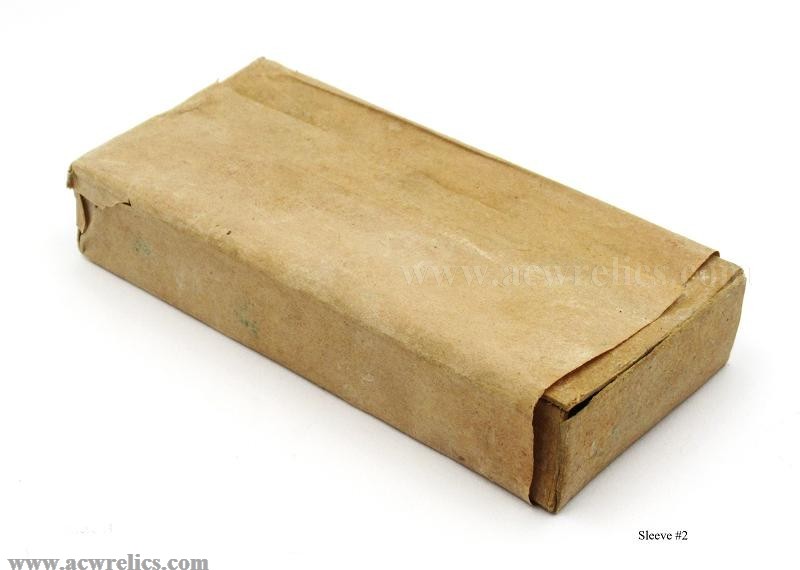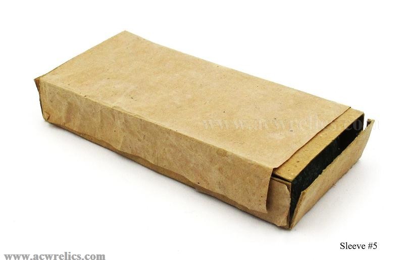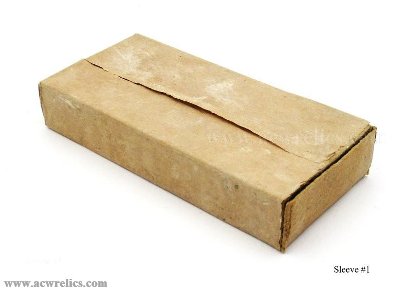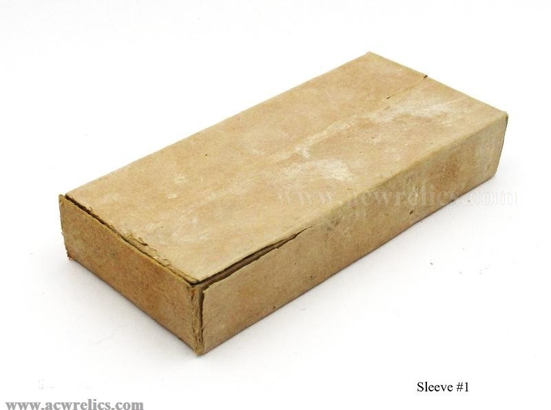 Sleeve #1: Full and correct pasteboard sleeve with outer paper wrapper. One end is partially opened, the other sealed.