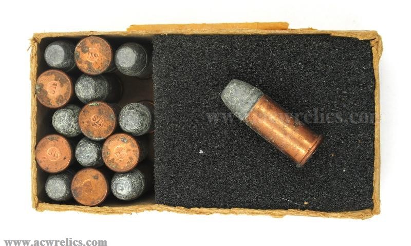 Description: Scarce example of a late 19th-century .44 Henry Rimfire ammunition box manufactured by the United States Cartridge Company of Lowell, Massachusetts. Commonly referred to by collectors as the "Woodcut” label, this box dates to the 1880s and originally contained 50 cartridges. It now holds 15 original rounds belonging to the .44 Henry Flat, Long Case family. Introduced around 1872, the long-case .44 Henry represented the final iteration of this iconic rimfire cartridge. While best known for its use in the Henry rifle, it was also chambered in the Winchester Model 1866 and the Colt Open Top Revolver.