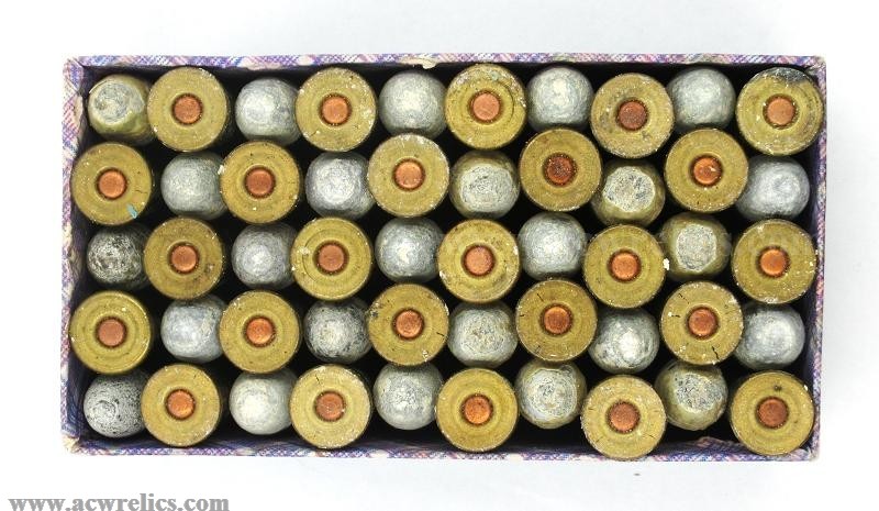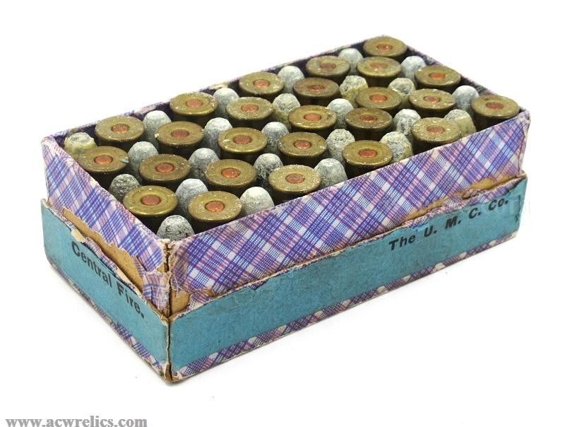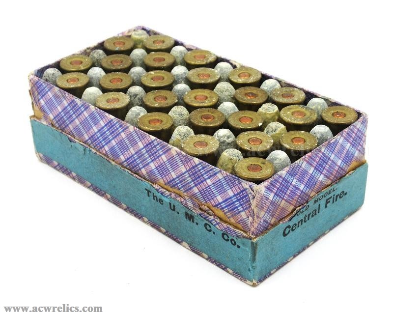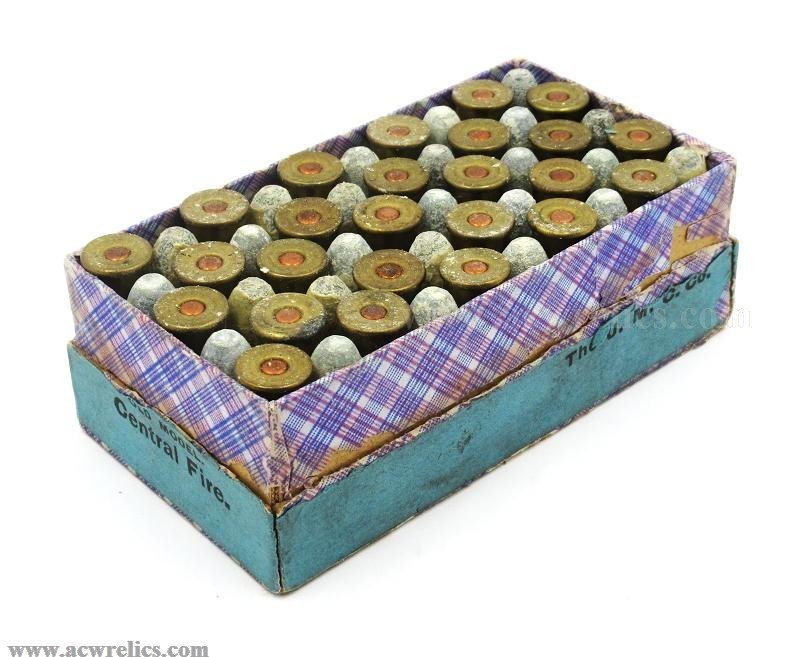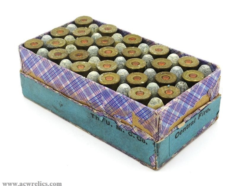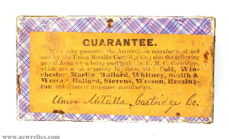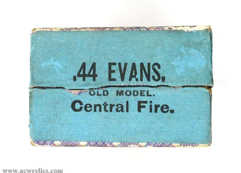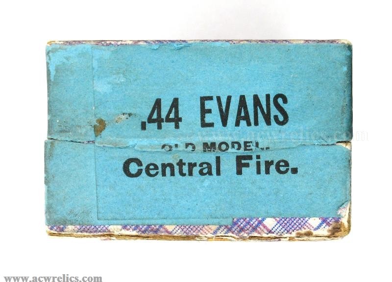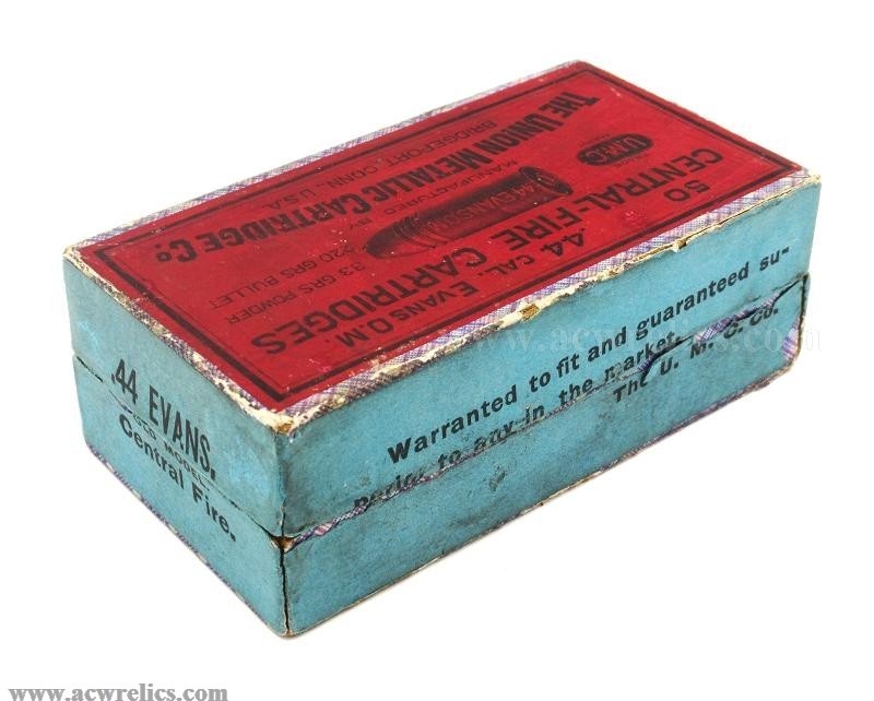 Description: Here is a very rare full and correct box of .44 Evans Old Model centerfire cartridges manufactured by the Union Metallic Cartridge Company of Bridgeport, Connecticut. This two-piece fabric box has a red top label with black print, a blue side-seal label with black print, and an orange bottom Guarantee label with black print. The box contains all 50 original centerfire cartridges; each loaded with a 220-grain bullet over 33 grains of powder. All cartridges appear to be original to the box, and several bullets retain their original lubricant, still visibly caked in place.