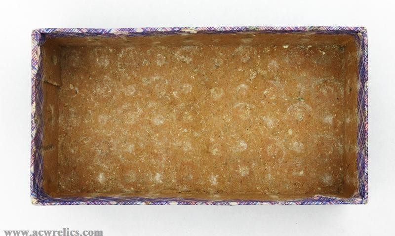 The box shows only very light overall soiling, primarily on the bottom panel. The lid remains solid with no split seams. The bottom half of the box is also intact, with just a single split seam at the lower left corner. Some loss of the fabric print around the edges of the interior slip-in piece is visible, which is typical for these boxes. All cartridges appear correct, original, and unheadstamped, exactly as expected for early UMC Evans ammunition. The corners show normal, honest wear for their age.